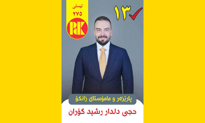 حەجی دلدار رەشید گۆران بەربژێرێ ژمارە 13 ل سەر لیستا 275 یا پارتی دیموكراتی كوردستان ل بازنەیێ بۆ رۆژناما ئەڤرۆ گۆت: بەرنامێ مە یێ تیرو تەسەلە بۆ گەنج و لاوان و جوتیاران و هەموو تەخ و چینێن كوردستانێ، چەوا ل دەمێ بۆری مە ب هەموو شیانێن خۆ خزمەتا جڤاكی كریە، دەمێ دبینە پەرلەمانتار ژی دێ هەمان خزمەت پێشكەش كەین و ئەم ل خزمەتكرنا جەماوەرێ خوە ماندی نابین.