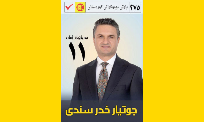 جۆتیار خدر سندی بەربژارێ ژمارە 19 ل سەر لیستا 275 یا پارتی دیمۆكراتی كوردستان ل بازنەیا دهۆكێ ل ئیدارا سەربخوە یا زاخۆ بۆ ڕۆژناما ئەڤرۆ دیاركر، ئەگەر ئەز ل هەلبژارتنێن پەرلەمانێ ئیراقێ دەرچووم و بوومە پەڕلەمانتار، دێ بەرەڤانیكەرێ مافێ خەلكێ خوە بم و دێ بمە ئەو كەسە كو بشێت بەرنامە و دیدا پارتی ل پەرلەمانێ ئیراقێ بجهبینیت.